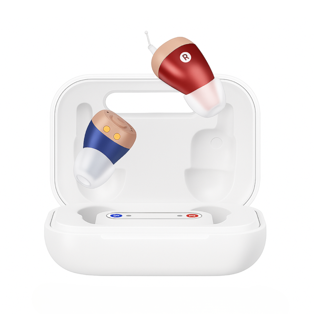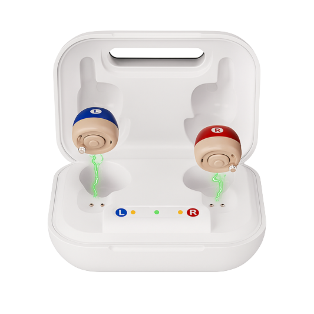 Your brand new pair of hearing aids with crystal clear audio, a comfy fit, fully adjustable volume settings and listening modes, 20 hours of rechargeable battery life, and easy to use controls.